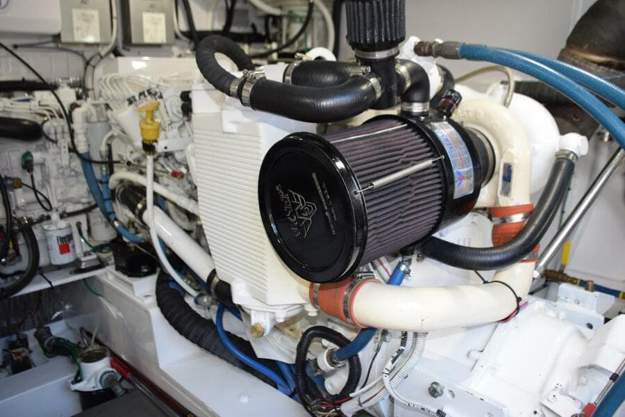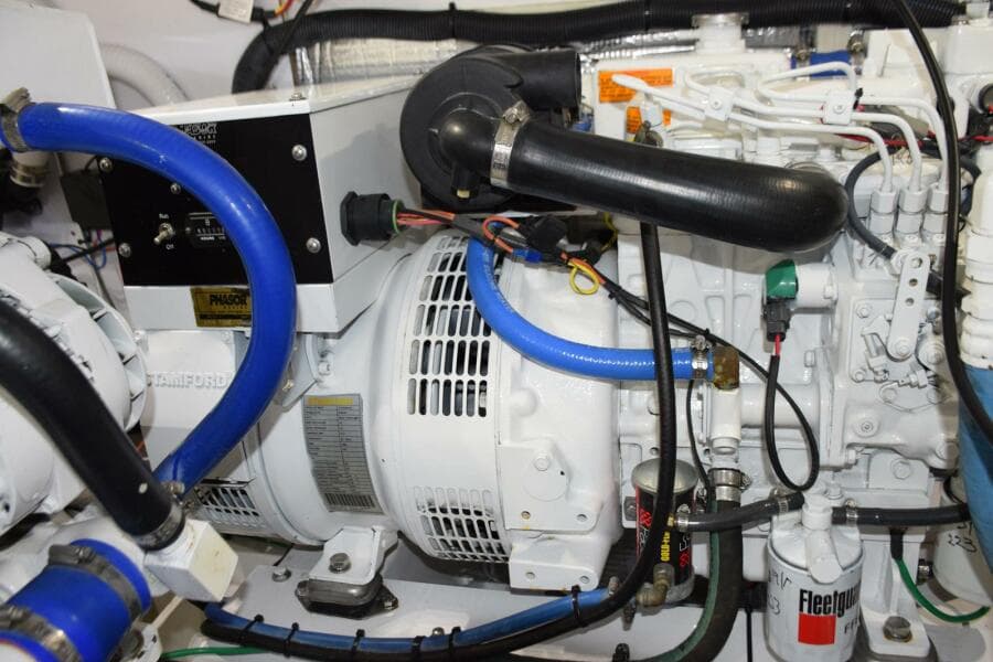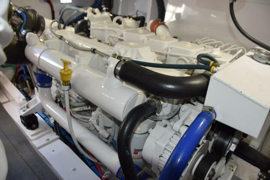 The Cummins 6BTA 5.9 inline-6 cylinder engines were New in 2006, they were removed from the boat in 2014 during this vessels refit period in Stuart, FL. While out of the boat they were partially disassembled for a thorough inspection which included new hoses, cooling system servicing, turbo updating, and complete painting. In 2019 the port motor was noted to have some differences and during the course of another full cooling system service to both motors, it was determined that the best solution was to overhaul the port motor. In late 2020 the starboard motor developed an oil leak and upon further investigation to cure it, the motor was removed from the boat and final result was that engine got a full overhaul. These motors have ZF IRM 220-A transmissions, 1.75:1 reduction gears. V-cast bronze struts, 1 3/4" stainless alloy shafts, 4-blade Nibral Michigan DQX props. There are a spare pair of Hi-Torq, 4-blade Nibral props. Bronze cast Spade-style rudders. Engines have a Walker Air-Sep crankcase ventilation system/air filters. Engine room entry from cockpit centerline, hatch when raised is supported by stainless gas spring shock.