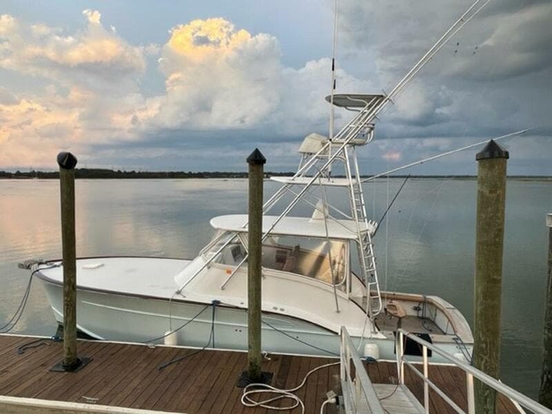 The finished project delivered a modern, stylish, and high-quality interior and bridge deck on a thoroughly refinished Classic Carolina hull. The first impression factor was raised dramatically with refinishing of the teak transom, teak coverboards (which were both new in '06), and the addition of a finely fitted and varnished teak helm pod. She also has a faux finished teak toe rail and a varnished bridge deck cap rail. Accented by varnished teak ladderback Bluewater helm and companion chairs and a Bluewater teak rocket launcher. The hull is light blue with a navy blue boot stripe and light grey bottom paint. The hull has a sharp entry forward with a subtle Carolina Flair, at her transom a notable tumblehome, and a classic broken shearline with hull side engine room vents. Decks and deckhouse are white with teak decking on the cockpit and bridge-deck soles. The finished project left the boatyard in February of 2016 and has seen very light usage since. The boat presents well and will make its next owner proud.